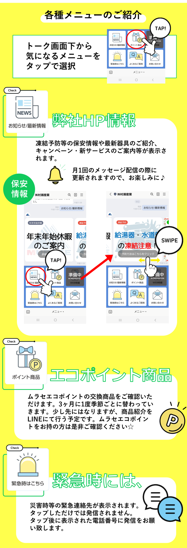 2026.04.03 お知らせ ㈱村瀬産業LINE公式アカウントのご案内 ㈱村瀬産業LINE公式アカウントのお知らせをいたします。 詳細は下記にてご案内致します。 友達追加をしていただくと、 WEB明細のご登録が簡単になります。 お手持ちのスマートフォンから友達追加される際は 緑の友達追加ボタンをご利用ください。